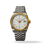 A stylish two-tone Chairman Geneve wristwatch featuring a crisp white dial and gold-tone baton hour markers. The watch is defined by its striking fluted gold-tone bezel and matching gold-tone crown, paired with a silver-and-gold Jubilee-style bracelet. It also includes a date window