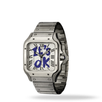A truly unique and expressive timepiece that merges iconic watch design with contemporary street art. This watch features a classic square stainless steel case and a robust H-link bracelet. The traditional Roman numeral white dial is dramatically customized with bold, blue, graffiti-style script that reads "IT'S OK". This design is a powerful conversation starter, blending luxury aesthetics with an uplifting, unconventional message. The crown features a blue cabochon, completing the sophisticated yet rebellious look