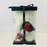 Celebrate love and serenity with the Milk White Rose Teddy Bear Hugging Flowers. Handcrafted from high-quality artificial foam roses, this 23cm bear on a 15cm × 15cm base holds a charming bouquet, making it a timeless symbol of affection.