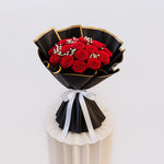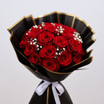A bouquet of bold romance and striking elegance. This dramatic arrangement of 17 rich red roses accentuated with delicate baby’s breath is wrapped in black and gold, making it a stunning statement of passion and style.