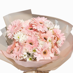 Elevate your gifting with our Sweetest Blush Bouquet. This delightful and sophisticated arrangement features a gathered collection of charming 10 pink gerbera daisies, their dark centers providing a striking focal point against the surrounding delicate white chrysanthemums. Expertly hand-wrapped in layers of premium, soft beige and peach translucent paper and finished with a coordinating ribbon, this bouquet exudes grace and sweetness, making it a perfect gesture for birthdays, congratulations, or "just because" moments.