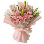 This soft pink bouquet features blooming lilies, delicate roses, and baby’s breath — all wrapped in multi-layered blush and white paper and tied with a romantic lace ribbon. It's an elegant embrace in floral form.