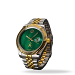 A two-tone automatic wristwatch featuring a gold fluted bezel and a Jubilee-style bracelet. It has a dark gray dial with a date window, gold-tone accents, and the Oman National Emblem in the center.